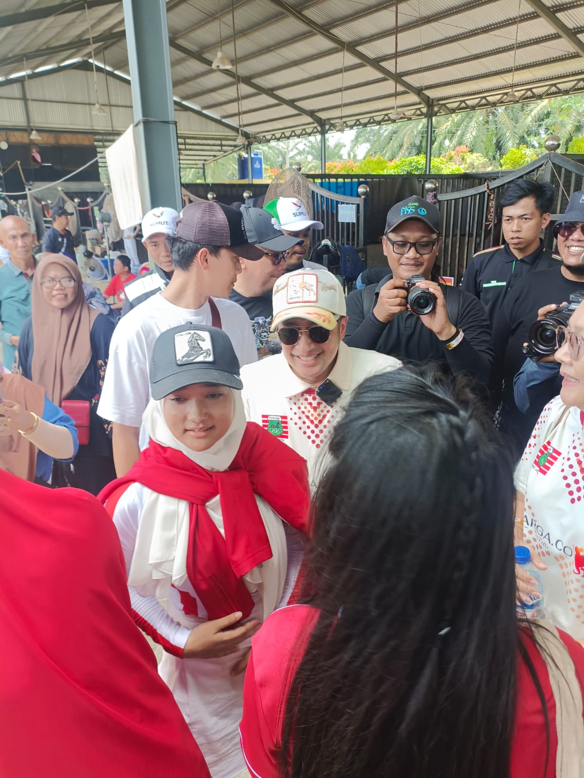 Penonton yang kebanyakan merupakan warga Serdang Bedagai mengerumuni Irfan Hakim yang hadir untuk menonton sang putri Aisha Maydina Hakim bertanding di nomor lomba Lompat Rintangan (Jumping).
