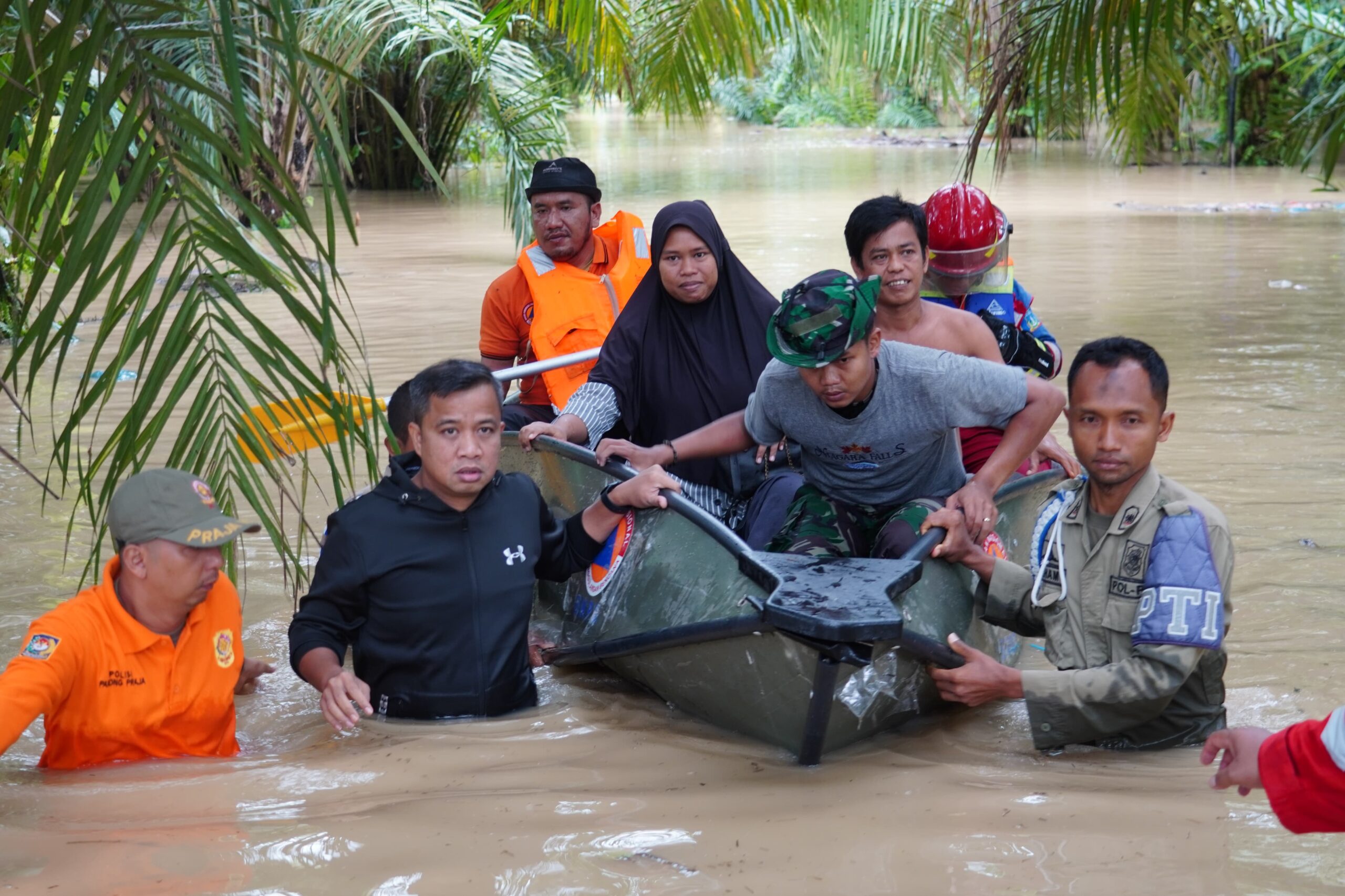 Penjabat (Pj) Wali Kota Tebing Tinggi, Dr. Moettaqien Hasrimi, S.STP, M.Si evakuasi korban banjir, Jumat (11/10/2024).