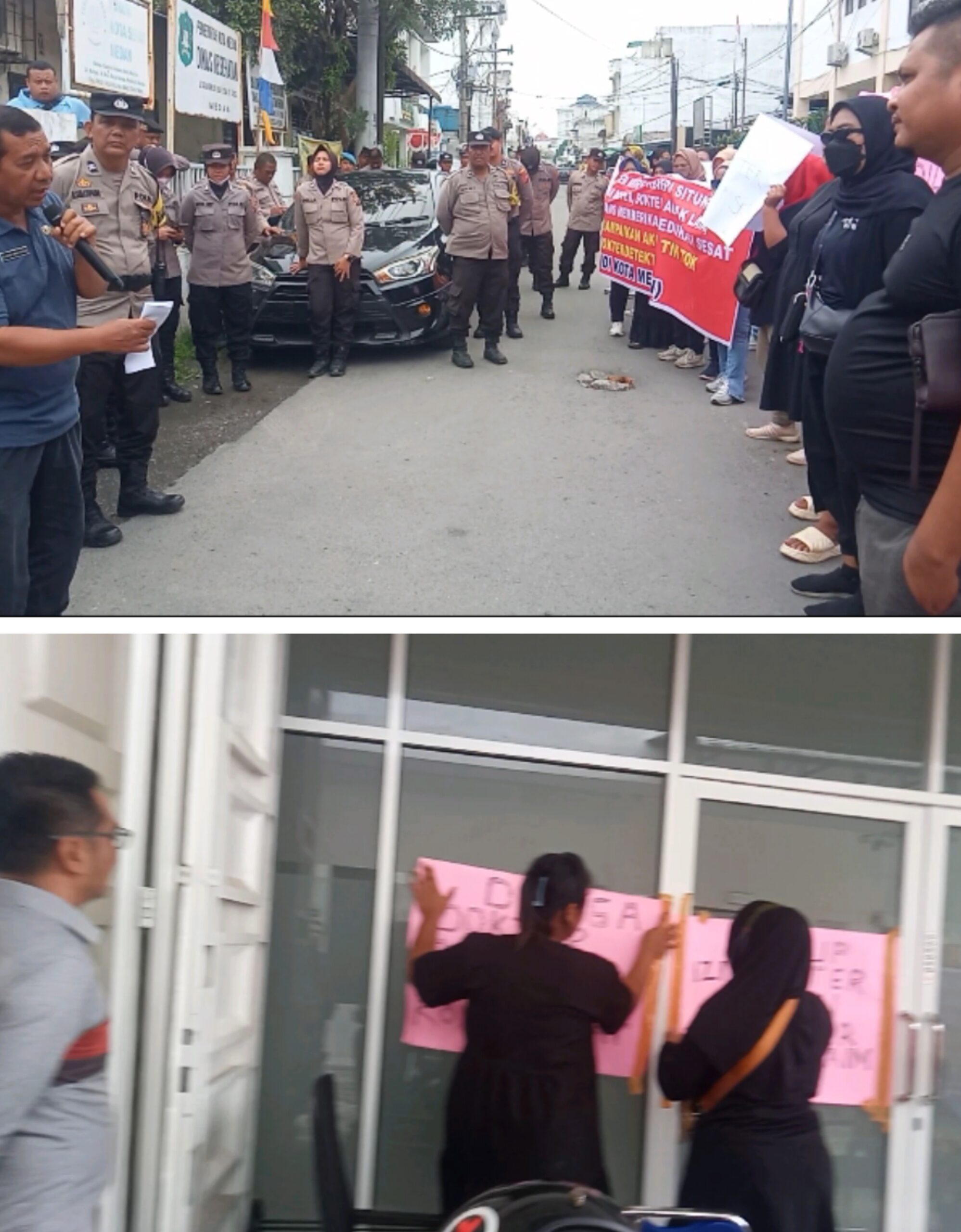 DEMO: Pengunjukrasa saat demo di kantor Dinkes Kota Medan (atas). Dan bawah, saat pengunjuk rasa mendatangi Klinik dr Andreas Henfri Situngkir di Jalan Tuamang Medan.