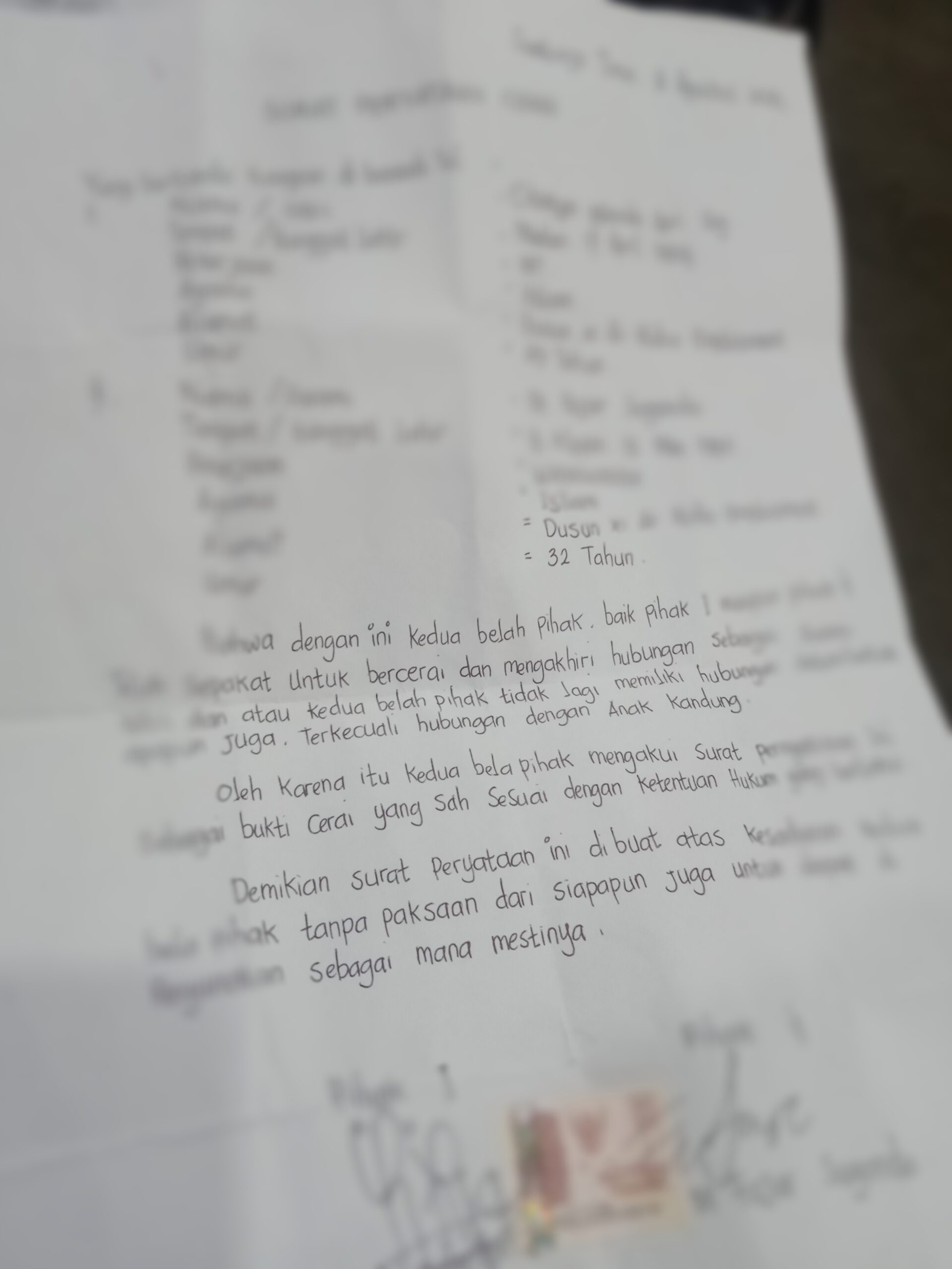 Surat pernyataan cerai kedua belah pihak.
