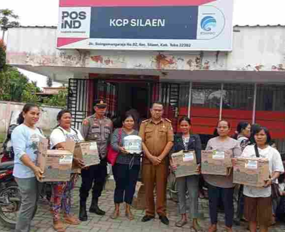 Pembagian bantuan berjalan kondusif, disaksikan Kapolsek Silaen Iptu. Pargaulan Manurung, Kepala Kantor Pos Silaen, Michael Siahaan dan beberapa tokoh masyarakat. (ril/wil)