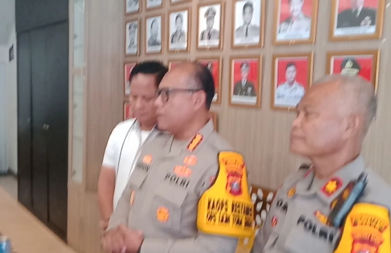 Kombes Pol Gidion Arif Setyawan didampingi Kasi Propam, Kompol Tomi dan Kasat Reskrim Kompol Jama Kita Purba saat memberikan keterangan kepada wartawan.
