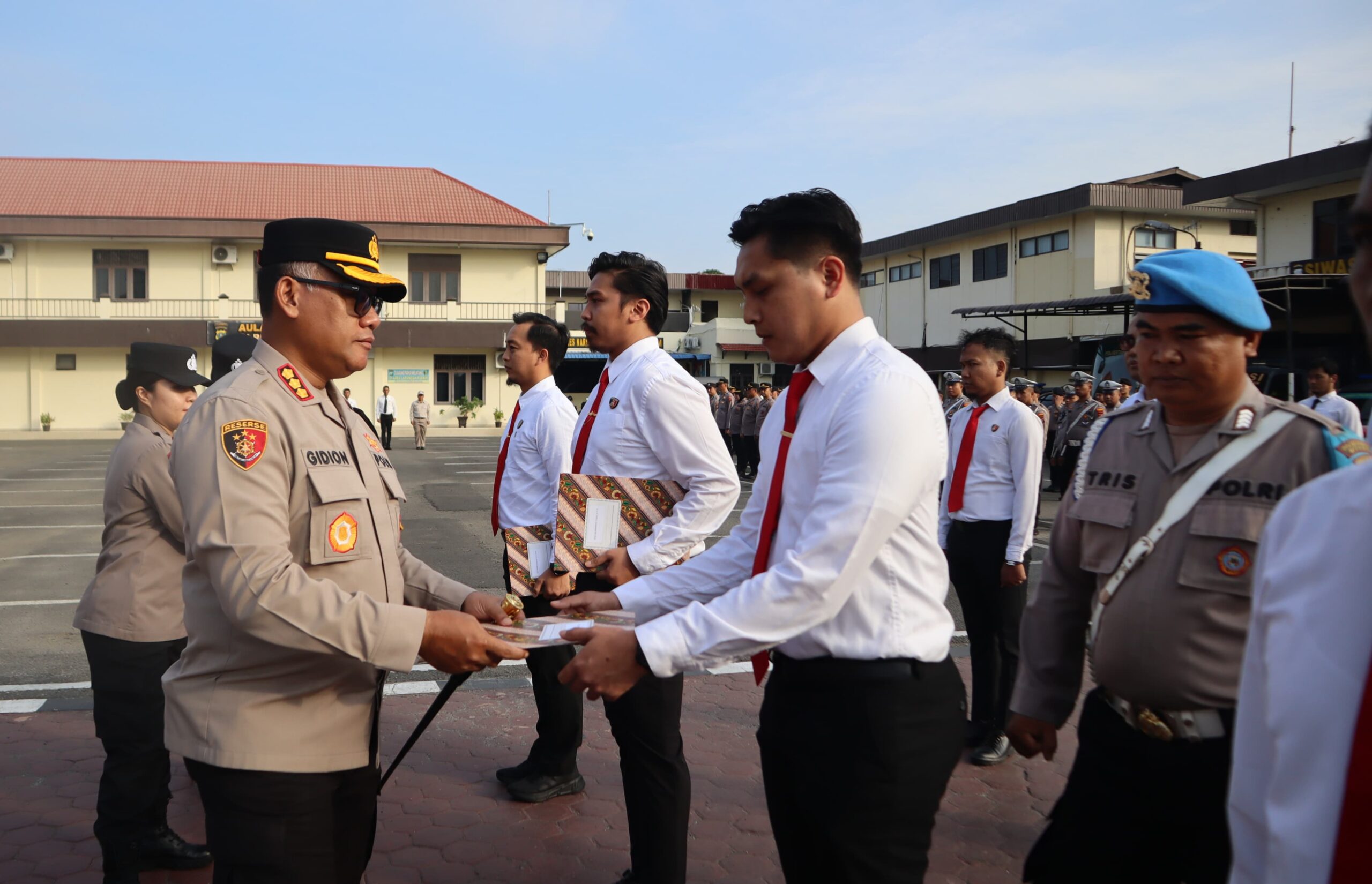 BERIKAN: Kapolrestabes Medan Kombes Pol Gidion Arif Setyawan saat memberikan penghargaan kepada personil.