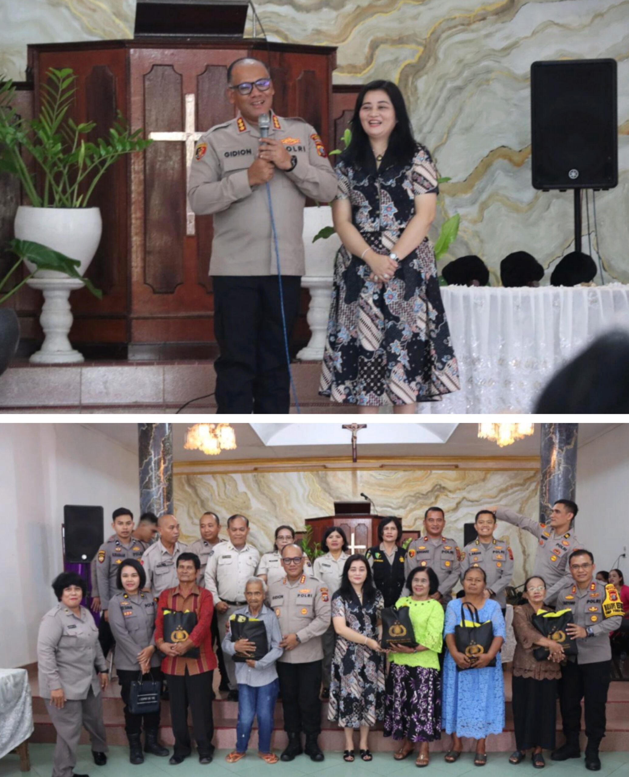 MINGGU KASIH: Kapolrestabes Medan Kombes Pol Gidion Arif Setyawan bersama Ketua Pengurus Cabang (PC) Bhayangkari Ny.Luciana Gidion Minggu Kasih di GBKP Rumah Mbacang.