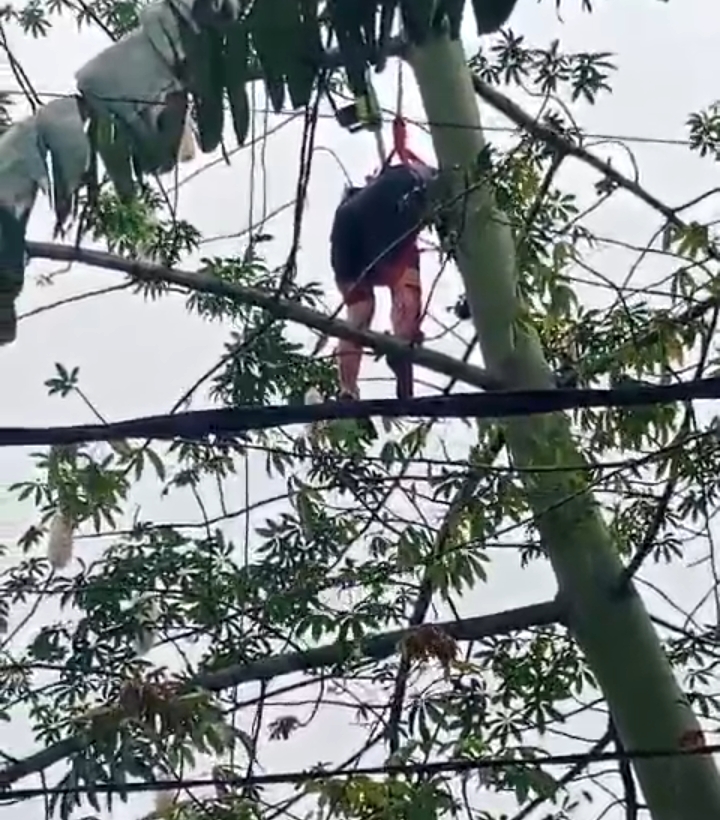 MEDAN – Seorang penebang kayu Budianto Simarmata (51), warga Jalan Teratai III, Perumnas Helvetia Medan tergantung di atas pohon, setelah terjatuh dan anggota tubuhnya terkena sinso yang digunakannya untuk menebang ranting-ranting pohon.