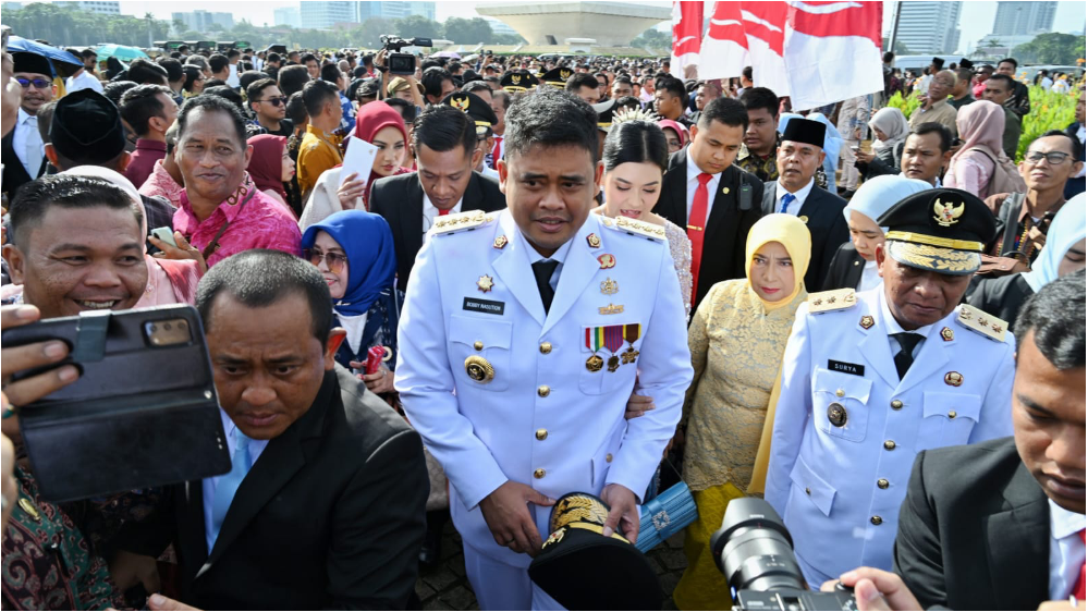 Bobby Afif Nasution hadir di Monas didampingi istrinya Kahiyang Ayu dan ketiga anaknya, sedangkan Wakilnya, Surya juga datang bersama keluarganya termasuk istrinya Titiek Sugiharti. Mereka bersama kepala daerah lainnya kemudian berjalan kalau dari Monas diiringi drumband menuju Istana Negara.