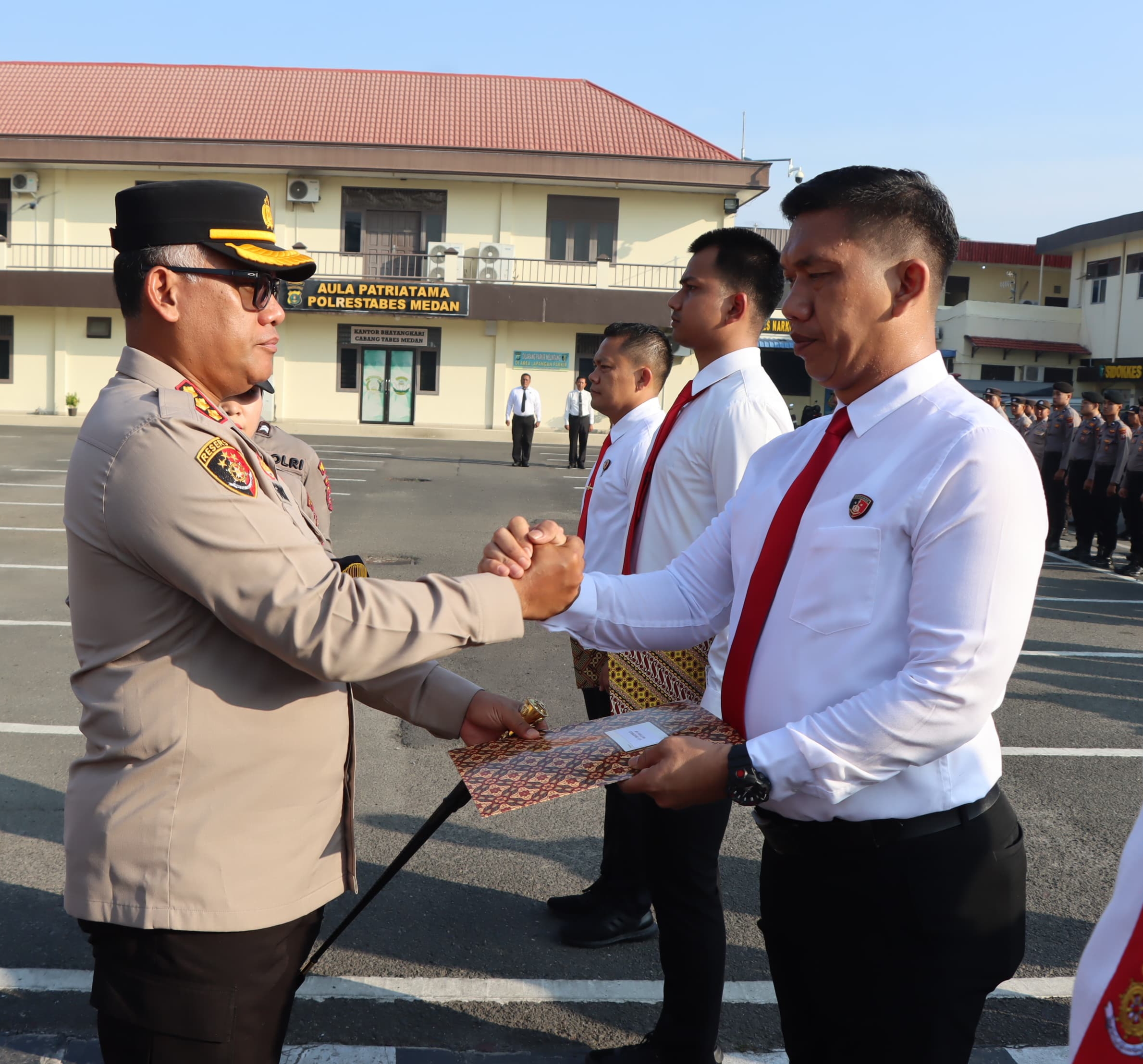BERIKAN: Kapolrestabes Medan Kombes Pol Gidion Arif Setyawan saat memberikan penghargaan kepada personil.