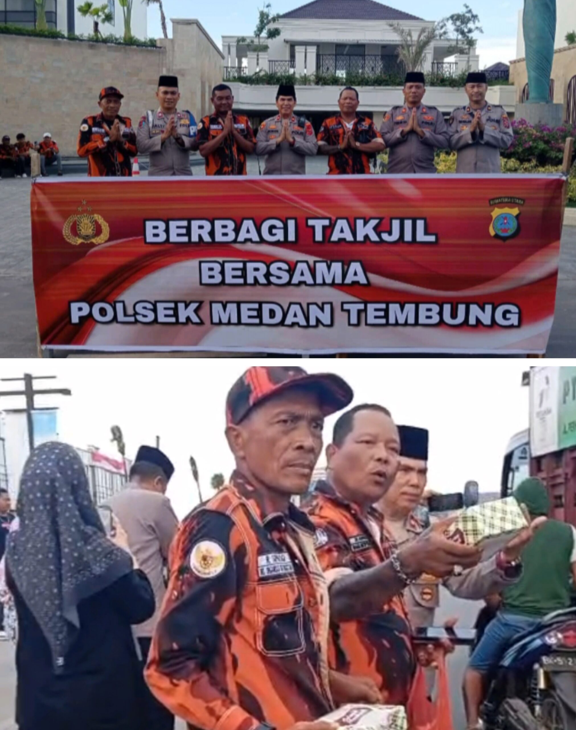 MEDAN – Polsek Medan Medan Tembung Polrestabes Medan bersama Ketua MPC Pemuda Pancasila (PP) Deliserdang, Junaidi dan Ketua PAC Kecamatan Percut Sei Tuan, Wagiman ‘Buang’ gelar pembagian takjil berbuka puasa bulan Suci Ramdhan 1446 Hijiriah rahun 2025 Masehi yang dilaksanakan di depan Perumahan Jewel, Jalan Meteorologi Desa Lau Dendang pada Sabtu (15/3/2025) sore.