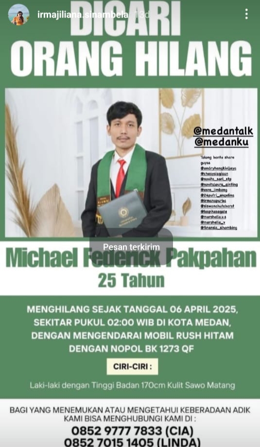 Korban sempat diberitakan menghilang oleh kakaknya. “Tolong infonya, telah hilang adik saya driver Indriver Medan. Terakhir kali lokasi di Kampung Lalang setelah mengantar tamu,” tulis akun Instagram @tkpnusantara pada Rabu (9/4/2025)..