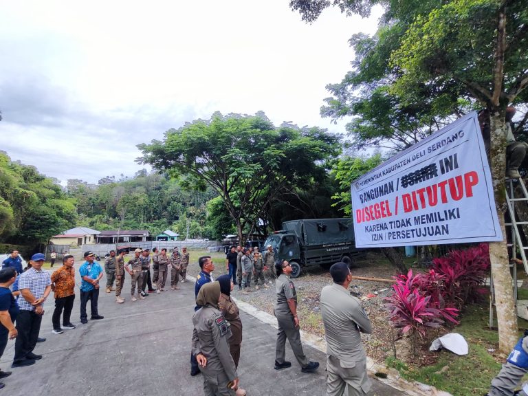 SIBOLANGIT – Belum memiliki izin Persetujuan Bangunan Gedung (PBG), bangunan gedung PT. Nirvana Memorial Nusantara yang berada di Desa Bingkawan Kecamatan Sibolangit Kabupaten Deli Serdang, disegel Satuan Polisi Pamong Praja.