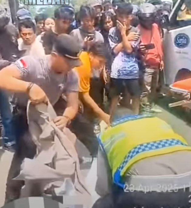 Tak berselang lama, persoel Polsek Medan Tuntungan bersama Kapolsek Iptu Eko Sanjaya tiba di lokasi dengan mobil ambulans.