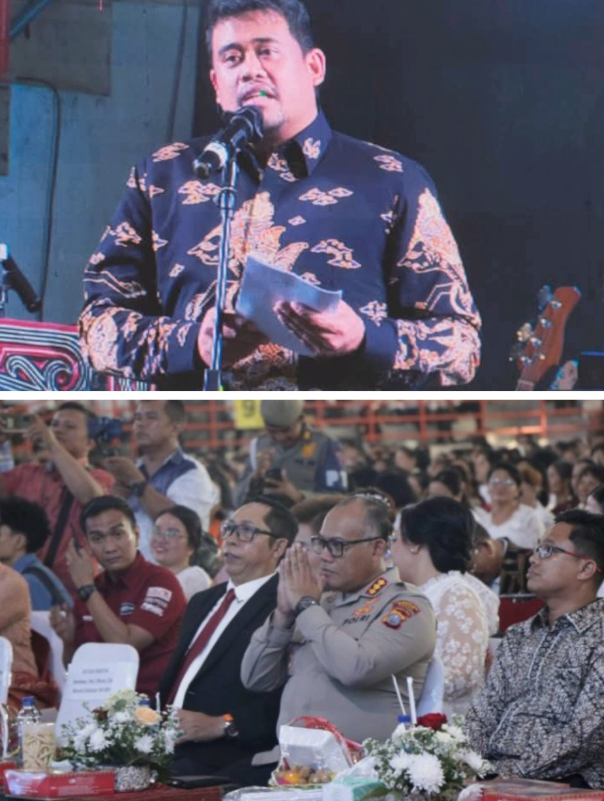 HADIRI: Gubernur Sumut, Bobby Afif Nasution dan Kapolrestabes Medan, Kombes Pol Gidion Arif Setyawan, saat menghadiri Kebaktian Kebangkitan Iman Paskah Raya HKBP, di GSG Dispora Sumut, Minggu (27/4/2025).