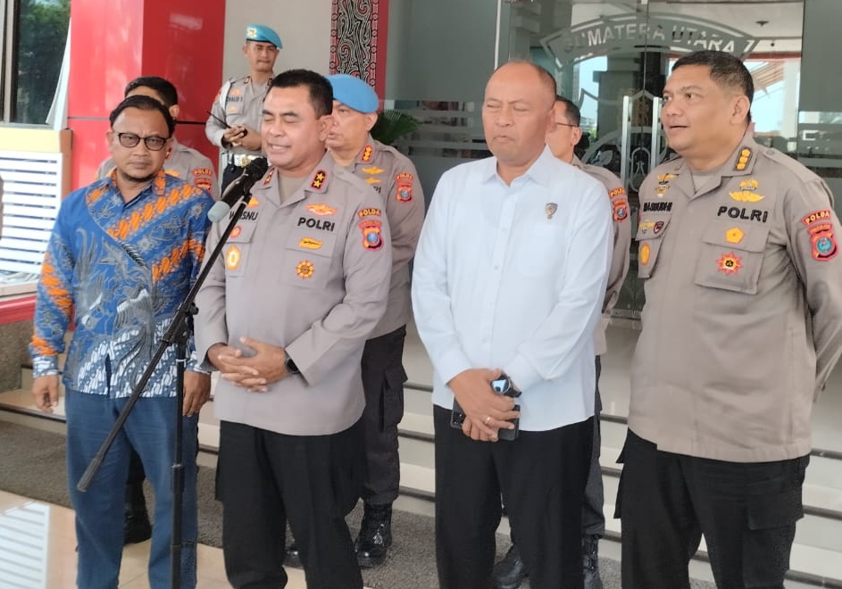 AJAK: Kapolda Sumut, Irjen Pol Whisnu Hermawan Februanto didampingi Komisioner Kompolnas, Choirul Anam dan Itwasum Polri memberikan keterangan kepada wartawan seputar kasus tertembaknya remaja di Belawan, Selasa (6/5/2025).