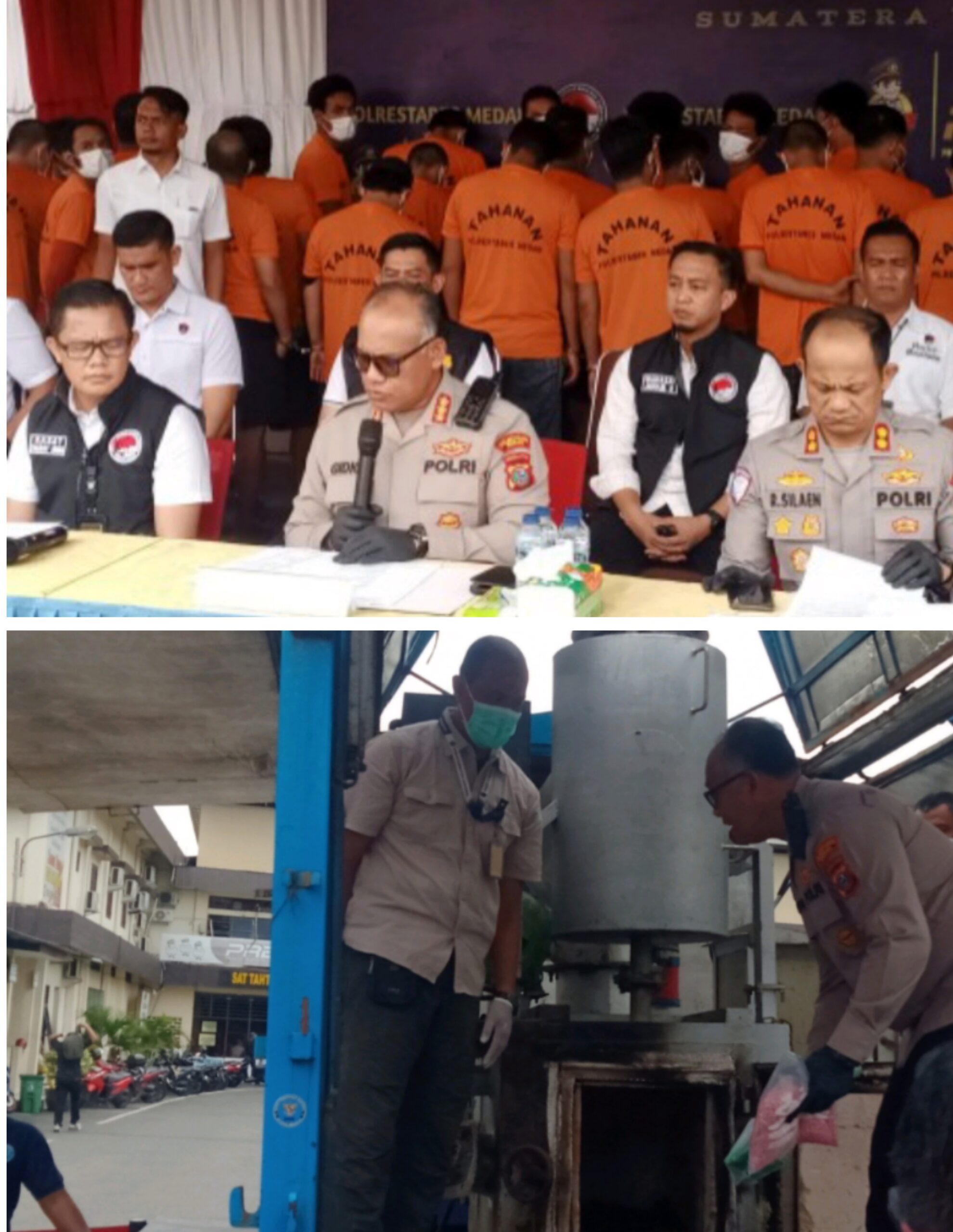 MUSNAHKAN: Kapolrestabes Medan, Kombes Gidion Arif Setyawan didampingi Waka Polrestabes Medan, AKBP Rudi Silaen dan Kasat Narkoba, AKBP Thommy Aruan saat menggelar konferensi Pers pemusnahan barang bukti narkoba. Dan bawah, Kombes Gidion Arif Setyawan saat memasukkan sabu ke mesin insinerator.