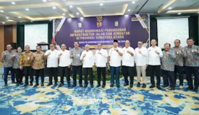 MEDAN – Bupati Batu Bara H. Baharuddin Siagian, SH, M.Si bersama Plt. Kadis PUTR Kabupaten Batu Bara dan Kepala Bappelitbangda Kabupaten Batu Bara menghadiri Rapat Koordinasi Penanganan Infrastruktur Jalan dan Jembatan di Provinsi Sumatera Utara yang diselenggarakan di Aula Inna 2 Hotel Grand Inna Lt. Dasar Jl. Balai Kota No. 2 Kesawan Medan, Rabu (14/05/2025).