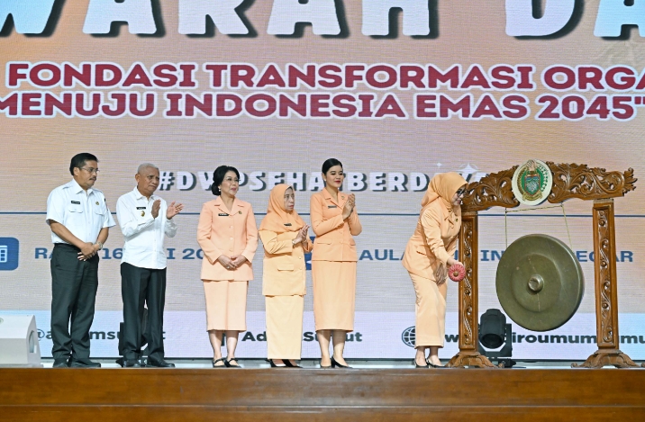 BUKA: Ketua Umum Dharma Wanita Persatuan Ida Budi G. Sadikin memukul gong tanda dibukanya Musyawarah Daerah V Dharma Wanita Persatuan Provinsi Sumut di Aula Raja Inal Siregar. lantai 2 Kantor Gubernur Sumut, Jalan Diponegoro No. 30, Medan, Rabu (16/7/2025).