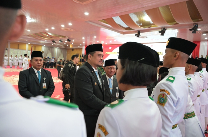 MEDAN – Gubernur Sumatera Utara (Sumut) Bobby Nasution mengukuhkan 71 anggota Pasukan Pengibar Bendera Pusaka (Paskibraka) Sumut, yang akan bertugas mengibarkan bendera pusaka pada 17 Agustus 2025 di Lapangan Astaka di Aula Tengku Rizal Nurdin, Jalan Sudirman 41 Medan, Jumat (15/8/2025).