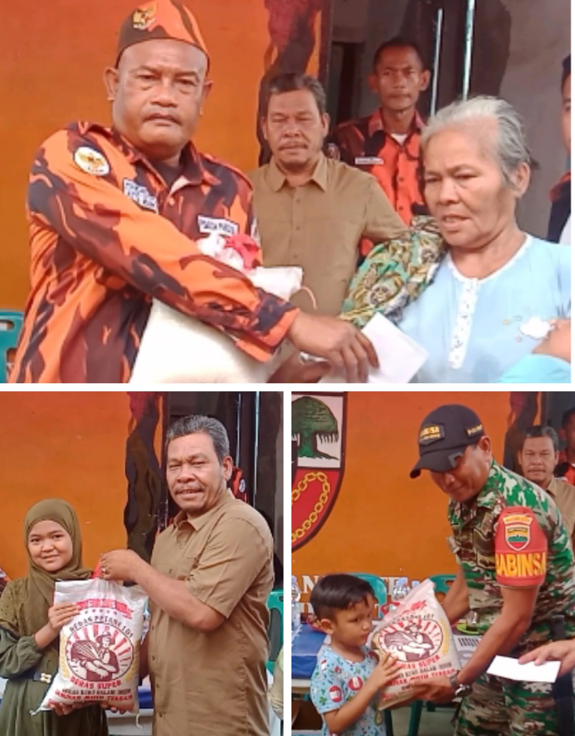BERIKAN: Ketua Ranting PP Medan Estate, Handre Anto ‘Begot’, Asdad Lubis, Sertu Sukarno saat memberikan beras kepada warga dan anak yatim. (Sormin/sadamanews.com)