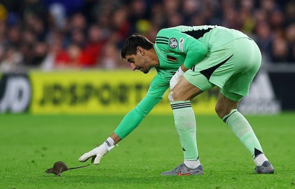TANGKAP: Kiper Belgia Thibaut Courtois berusaha menangkap tikus yang masuk lapangan saat laga penting negaranya menghadapi Wales dini hari tadi. (ist)