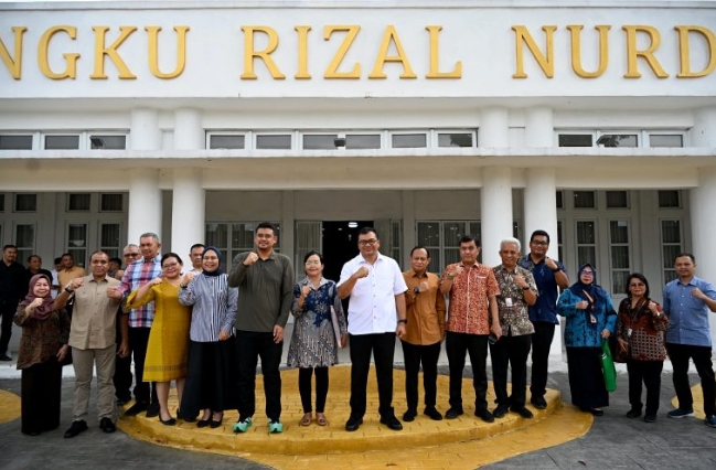 FOTO BERSAMA : Gubernur Sumut Muhammad Bobby Afif Nasution foto bersama dengan Bupati Deliserdang, Asri Ludin Tambunan dan pejabat lainnya di Aula Tengku Rizal Nurdin, Jalan Sudirman No. 41 Medan, Minggu (2/11/2025), menyikapi video viral yang dibuat Aparatur Sipil Negara (ASN) Dinas Kesehatan Deliserdang. (Diskominfo Sumut )