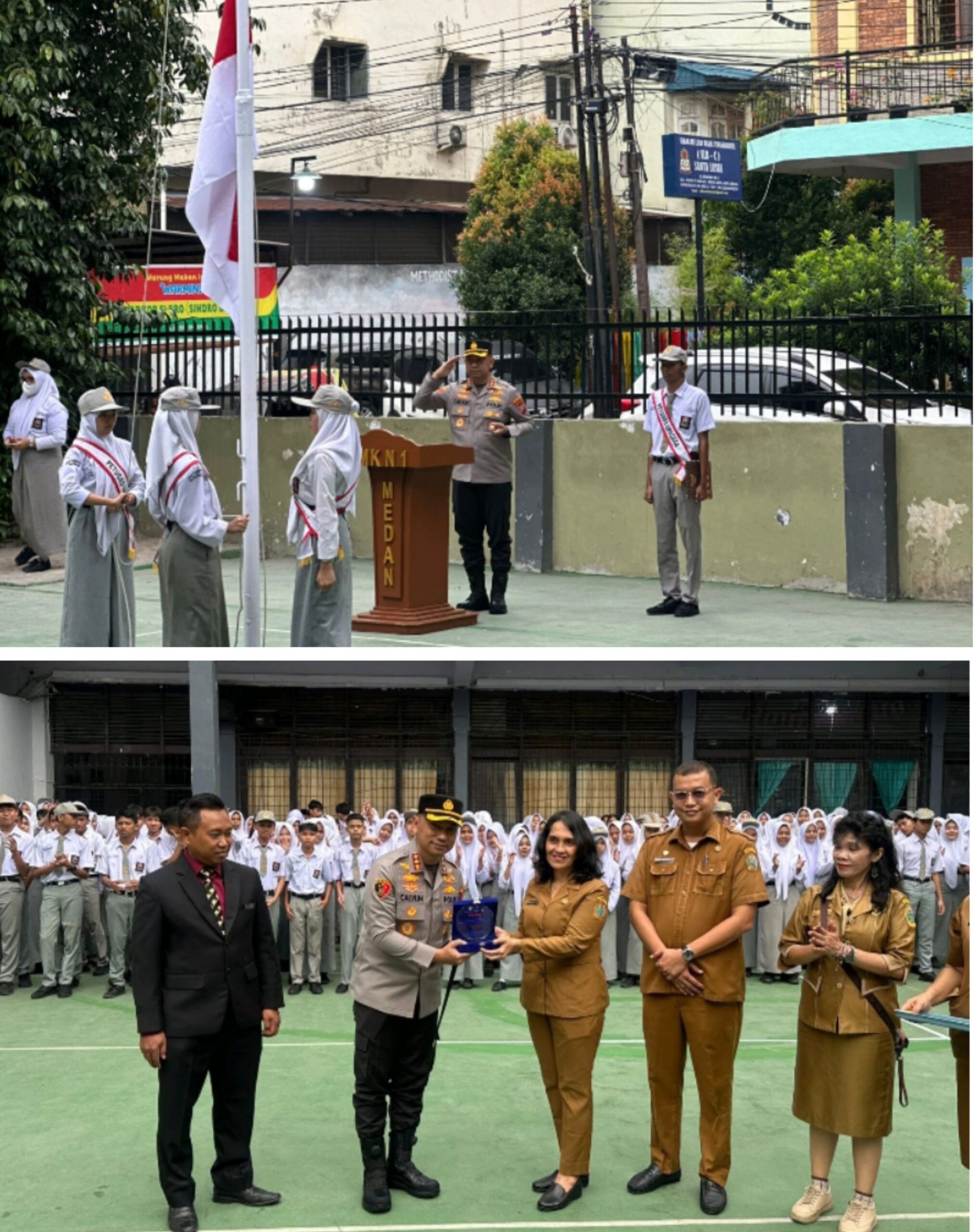 PIMPIN: Kapolrestabes Medan Kombes Pol Dr. Jean Calvijn Simanjuntak, S.I.K., M.H., memimpin upacara bendera di SMK Negeri 1 Medan, Jalan Sindoro, Kecamatan Medan Kota, Senin (3/11/2025) pagi (atas). Bawah,