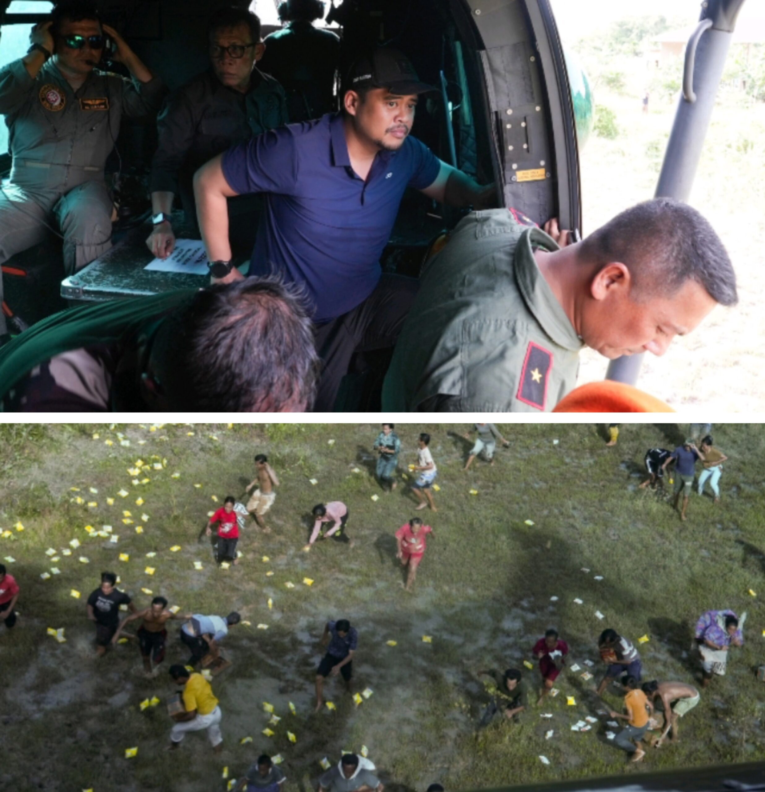 SALURKAN : Gubernur Sumatera Utara, Muhammad Bobby Afif Nasution menyalurkan bantuan melalui helikopter. Dan bawah, warga saat mengambil bantuan. (ist)