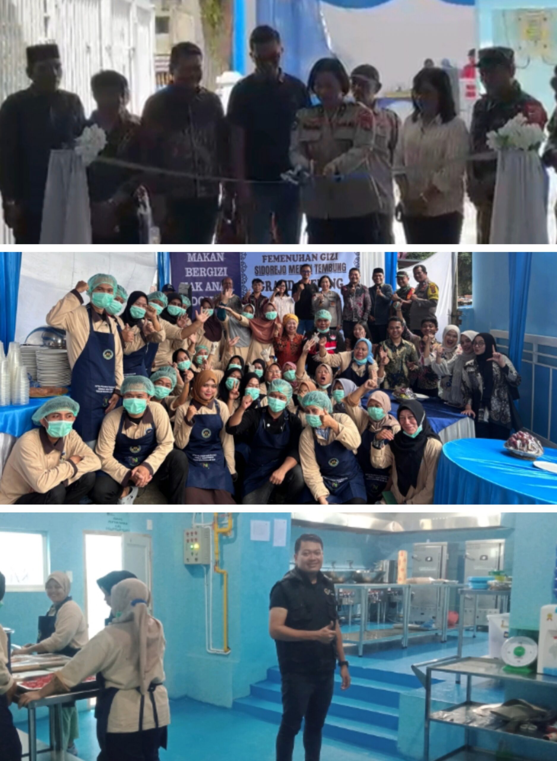 GUNTING PITA: Kabag SDM Polrestabes Medan, Kompol  Romauli Tampubolon saat menggunting pita tanda diresmikannya SPPG Sidorejo Medan Tembung (atas). Tengah dan bawah, manajemen dan karyawan SPPG Sidorejo Medan Tembung serta Bayu Pratomo menunjukkan kondisi dapur. (ist)