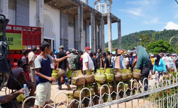 ANTRE : Warga Tapanuli Tengah sedang mengantre gas rumah tangga 3Kg di Masjid Agung Al-Muslimin di Pandan, Tapteng, Rabu (3/12). Ini merupakan pasokan gas rumah tangga pertama di Tapteng setelah banjir dan longsor melanda wilayah ini sejak 26 November 2026. Terlihat dua truk gas rumah tangga tiba di Pandan siang hari dan langsung diserbu warga sekitar. (DISKOMINFO SUMUT)