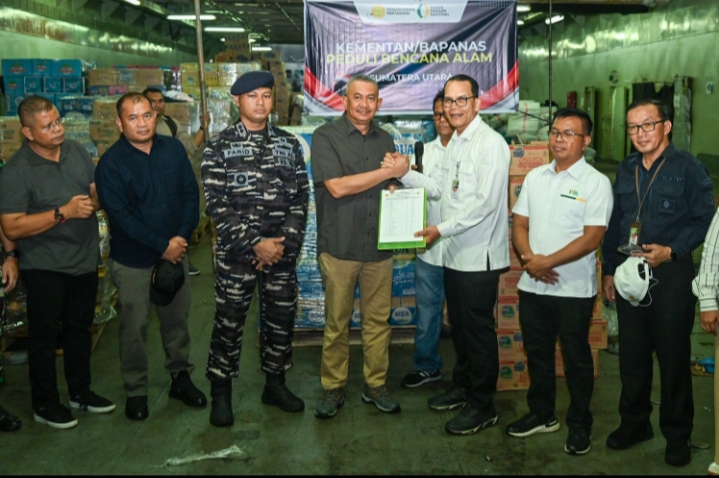 TERIMA : Pj. Sekdaprov Sumut, Sulaiman Harahap menerima bantuan logistik tahap 3 dari Kementerian Pertanian Republik Indonesia (Kementan RI) dan Badan Pangan Nasional (Bapanas) untuk Kabupaten/Kota yang terdampak bencana banjir dan longsor di Sumut yang diserahkan langsung oleh Staf Ahli Bidang Infrastruktur Pertanian Kementan RI Ali Jamil di Dermaga Bandar Deli, Jalan Pelabuhan Lama, Belawan, Medan, Sabtu (27/12/2025).