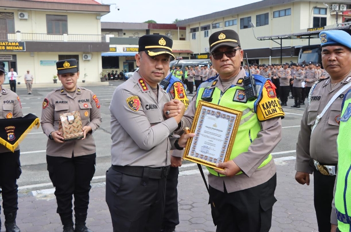 Kepala Pos Pengamanan (Ka Pos Pam), Iptu Nizar Nasution, dalam acara penyerahan penghargaan yang berlangsung di Mapolrestabes Kota Medan pada Senin pagi