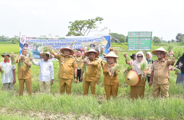 Usai panen bawang merah, Bupati dan Wakil Bupati melanjutkan dengan panen padi di lahan milik Poktan Jaya Tani di desa yang sama. Total luas lahan sawah Poktan Jaya Tani mencapai 70 hektare.