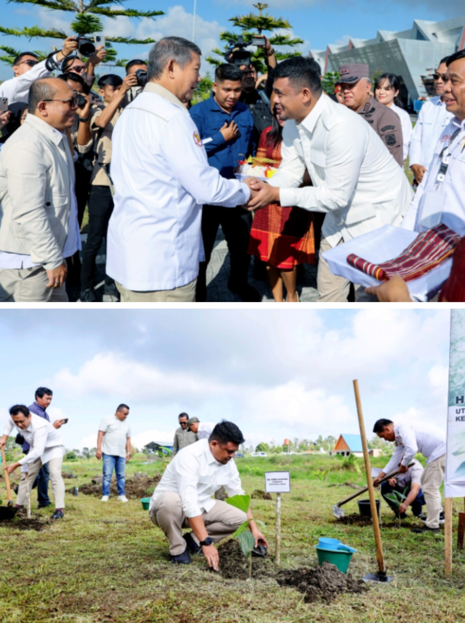 TAPUT – Gubernur Sumatera Utara (Sumut) Muhammad Bobby Afif Nasution turut mengikuti penanaman sejuta pohon bersama dengan Utusan Khusus Presiden Republik Indonesia Hashim Djojohadikusumo di Kompleks Perkampungan Pemuda HKBP Jetun Silangit, Tapanuli Utara (Taput), Minggu (11/1/2026).