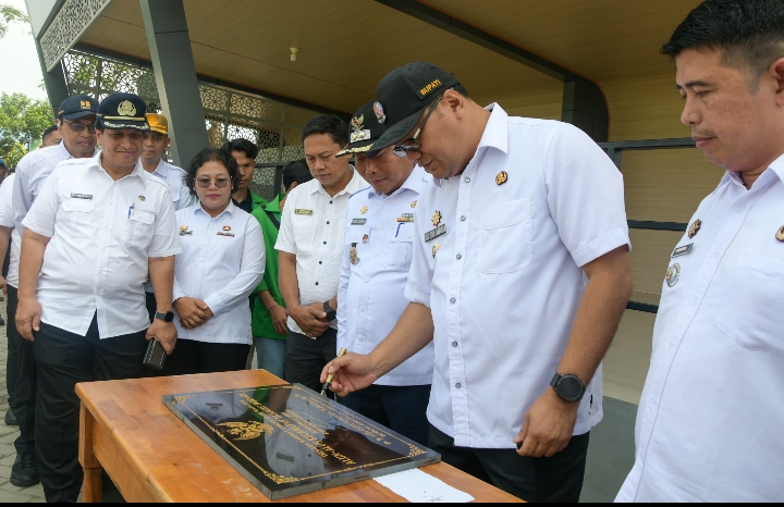 TANDA TANGANI: Bupati Deli Serdang, dr H Asri Ludin Tambunan menandatangani prasasti peresmian Alun-Alun Kecamatan Tanjung Morawa di Jalan Sultan Serdang, Desa Buntu Bedimbar, disaksikan Wakil Bupati, Lom Lom Suwondo SS dan Camat Tanjung Morawa, Gontar Syahputra Panjaitan SSTP MM, Rabu (4/2/2026).