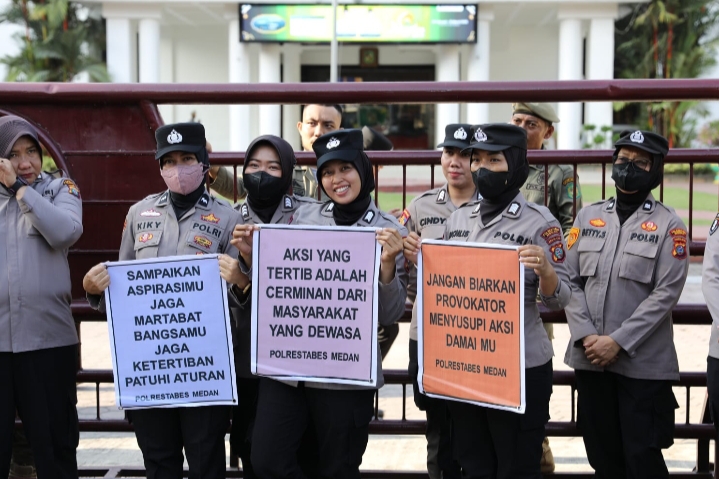 Berbeda dari pola pengamanan pada umumnya, para Polwan tidak membawa tameng maupun perlengkapan taktis. Mereka justru membentangkan poster berisi pesan-pesan humanis seperti “Sampaikan Aspirasimu, Jaga Martabat Bangsamu”, “Aksi Tertib adalah Cerminan Masyarakat Dewasa”, dan “Jangan Biarkan Provokator Menyusupi Aksi Damai”.