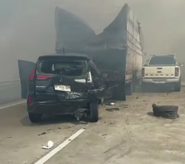 Dalam video yang beredar, terlihat sedikitnya satu unit truk dan dua mobil penumpang mengalami kecelakaan. Kendaraan-kendaraan tersebut tampak berhenti di badan jalan setelah diduga kehilangan jarak pandang akibat asap tebal menyelimuti ruas tol.