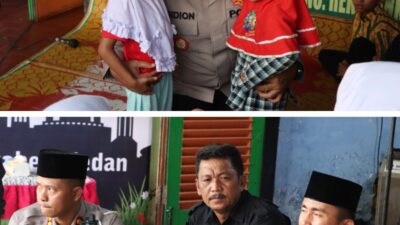 PELUK: Kapolrestabes Medan Kombes Pol Gidion Arif Setyawan saat memeluk anak yatim pada kegiatan “Polrestabes…