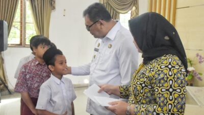 SERAHKAN: Bupati Deli Serdang, dr H Asri Ludin Tambunan saat menyerahkan santunan kepada 100 anak…