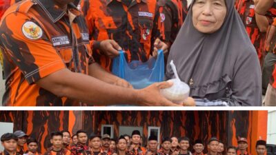 BERIKAN: Ahmad Zailani saat memberikan takjil kepada warga. Pengurus PAC Pantai Labu saat foto bersama….
