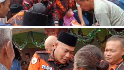 BAGIKAN : Ketua MPC PP Deliserdang, Junaidi saat membagikan nasi kotak kepada jemaah Mesjid Raya…