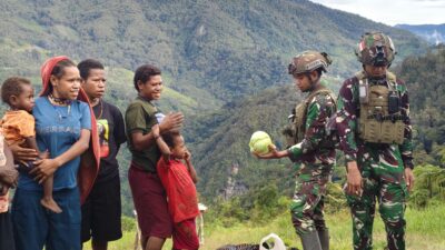BORONG : Prajurit TNI dari Satgas Yonif 700/Wira Yudha Cakti saat membeli sayuran dari warga….