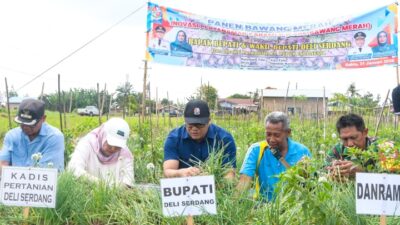 PANEN: Bupati Deli Serdang, dr H Asri Ludin Tambunan melakukan panen bawang di Dusun PW…