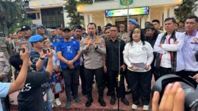 SIAP: Kapolrestabes Medan Kombes Jean Calvijn Simanjuntak saat memberikan keterangan kepada para pengunjuk rasa. (ist)…