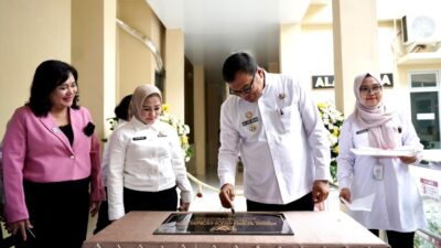 TANDA TANGANI: Bupati Deli Serdang, dr H Asri Ludin Tambunan menandatangani prasasti peresmian Gedung Rawat…