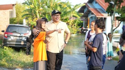 TINJAU: Bupati Deli Serdang, dr H Asri Ludin Tambunan mendengar keluhan sambil memegang bahu warga….