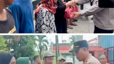 BERIKAN: Kapolsek Medan Tembung, Kompol Johnson Sitompul dan Wakapolsek AKP Japri Simamora saat memberikan takjil…