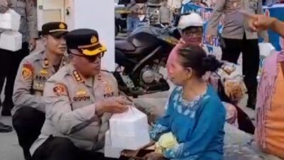 BERIKAN: Kapolrestabes Kota Medan, Kombes Pol Gidion Arif Setyawan saat membagikan takjil ke warga. MEDAN…