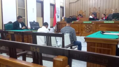 SIDANG : Mantan Ketua KONI Kabupaten Langkat Tengku Parìs (kiri) dan Tengku Ananda, tidak lain…