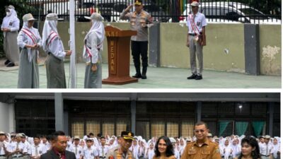 PIMPIN: Kapolrestabes Medan Kombes Pol Dr. Jean Calvijn Simanjuntak, S.I.K., M.H., memimpin upacara bendera di…
