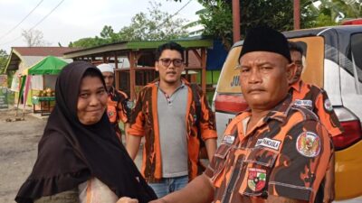 BERIKAN: Begot saat memberikan takjil kepada warga. DELI SERDANG – Dua Ranting Pemuda Pancasila (PP) Kecamatan…