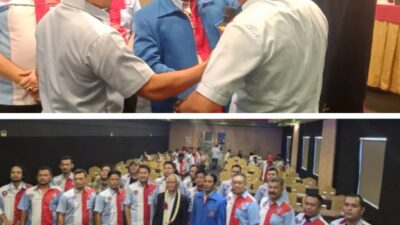 SERAHKAN: Bayu Pratomo saat menerima pataka dari Rudianto selaku Ketua DPD F.SPTSI – K.SPSI Sumut….